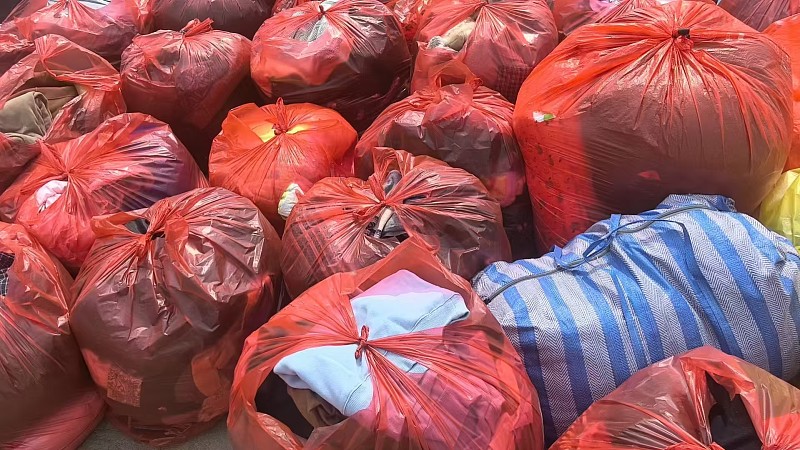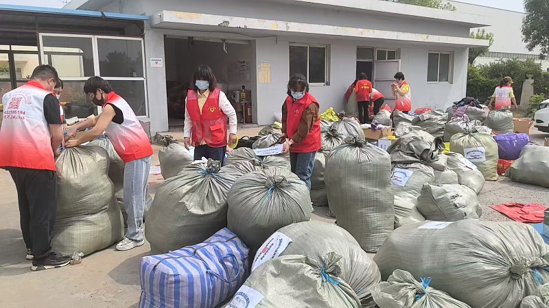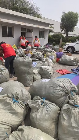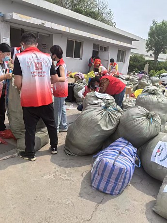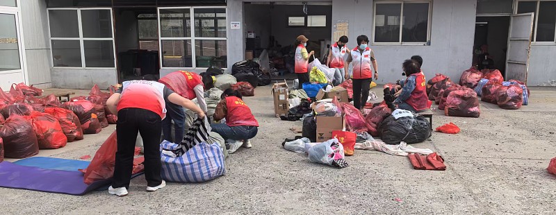 这时,王俊升和高梅梅夫妇带着儿子也来到了现场,加入了打包的队伍。王俊升考虑到一般的塑料袋在运往大凉山的途中很容易破损,于是自己买来了更加结实的编织袋。大家一起动手,将塑料袋打包好的衣物一袋袋地装进编织袋中,再把袋口缠紧,确保无论运输途中多么颠簸,物资都不会破损,一定能安全抵达大凉山。